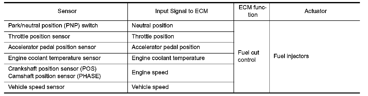 If the engine speed is above 1,800 rpm with no load (for example, in neutral and engine speed over 1,800 rpm) fuel will be cut off after some time. The exact time when the fuel is cut off varies based on engine speed.