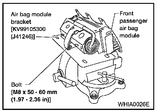 3. Match the two holes in air bag module bracket (held in vise) and front passenger air bag module and fix them with two bolts [M8 x 25 - 30 mm (0.98 - 1.18 in)].
