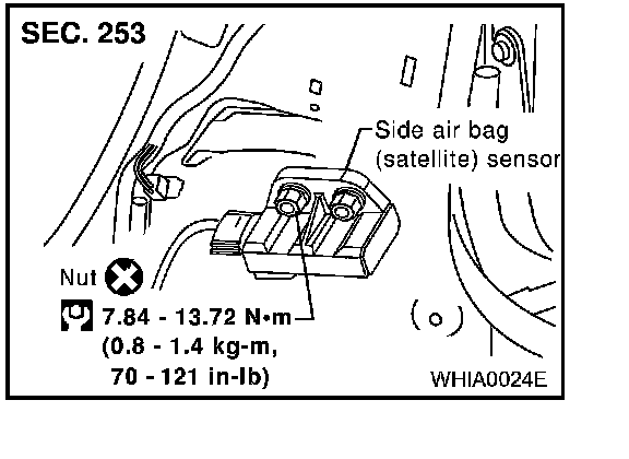 - After replacement of side air bag (satellite) sensor, perform self-diagnosis to check that no malfunction is detected. Refer to "SRS Operation Check".