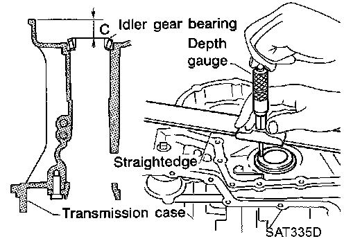 ^ Measure dimension "C" between the surface of idler gear bearing inner race and the surface of transmission case.