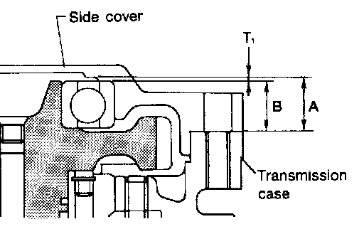"B": Distance between the end of output shaft bearing outer race and the side cover fitting surface of transmission case.