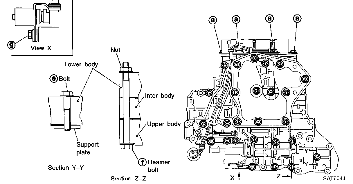 i. Install bolts e from bottom of lower body. Using bolts e as guides, install separating plate and gaskets as a set.