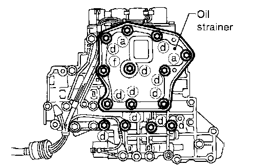 1. Remove bolts a, d and nut f and remove oil strainer from control valve assembly.