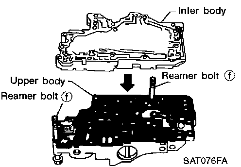 c. Install reamer bolts f from bottom of upper body. Using reamer bolts as guides, install separating plate and gaskets as a set.