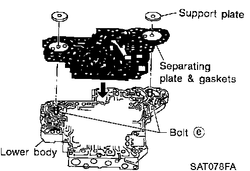7. Remove bolts e, separating plate and separating gasket from lower body.