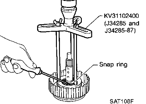 5. Set Tool on spring retainer and remove snap ring from high clutch drum while compressing return springs.