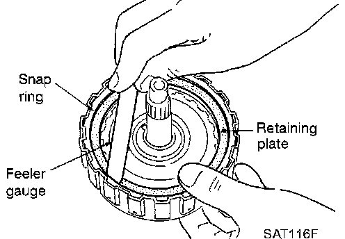 7. Measure clearance between retaining plate and snap ring. If not within allowable limit, select proper retaining plate.