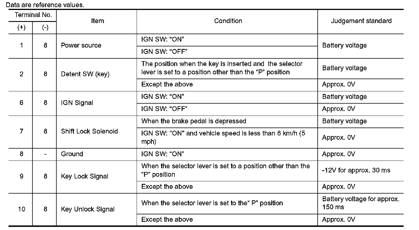 Shift Lock Control Unit Reference ValuesSHIFT LOCK HARNESS CONNECTOR TERMINAL LAYOUT