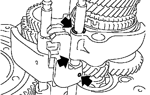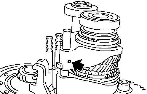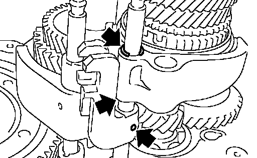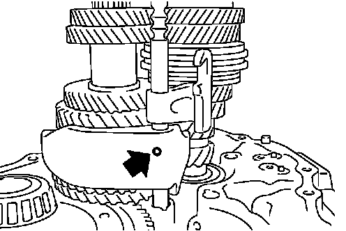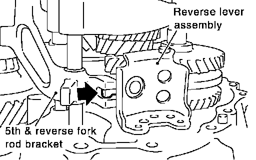 b. While lifting reverse shift fork, align cam with 5th-reverse bracket.