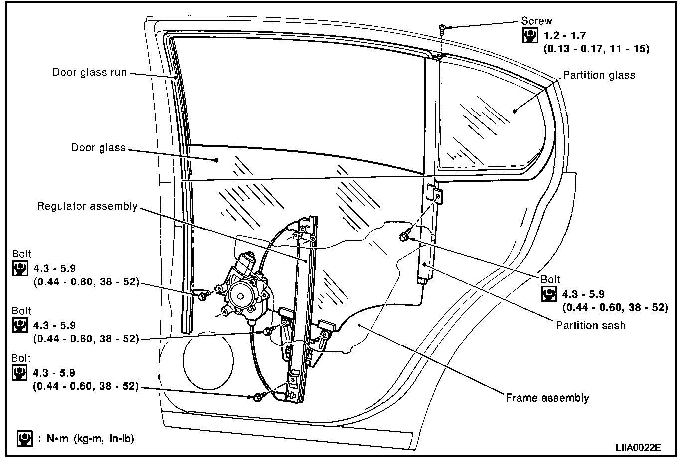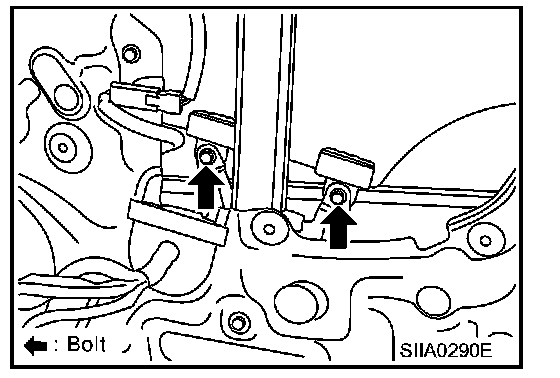 3. Operate the power window switch to raise/lower the door window until the glass mounting bolts can be seen.