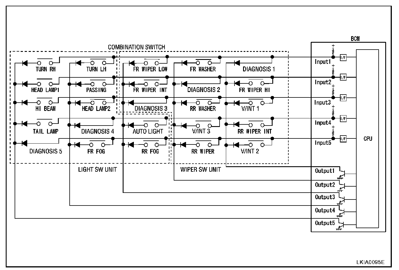 BCM reads combination switch (wiper switch) status, and controls front wipers based on the results. BCM is a combination of 5 output terminals (OUTPUT 1 - 5) and 5 input terminals (INPUT 1 - 5). It reads 20 types of switch data and 5 types of diagnosis data.