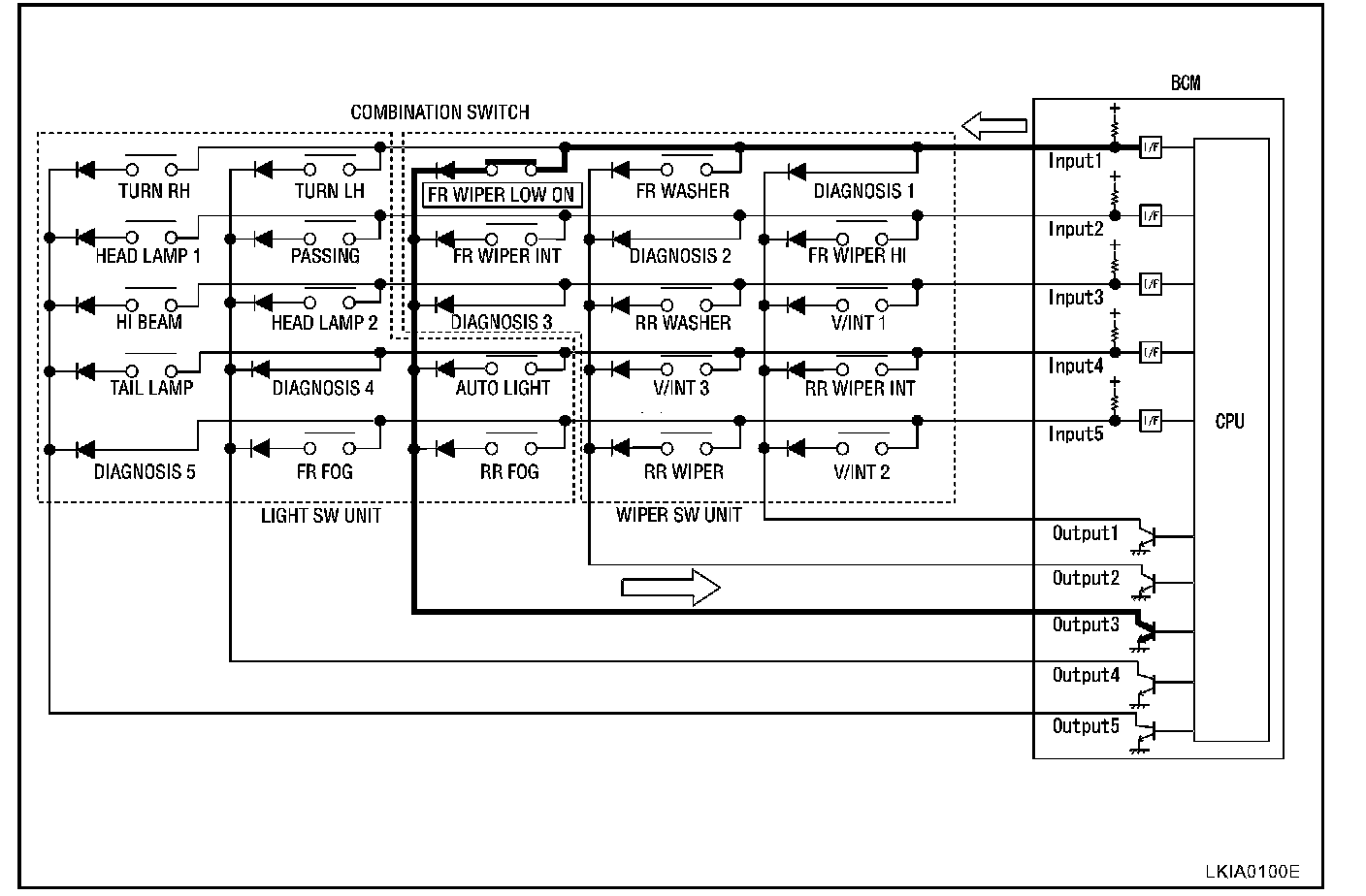 - When wiper switch is turned to LO position, front wiper LO contact inside combination switch becomes ON. At this time, OUTPUT 3 transistor operates and BCM detects flow of current at INPUT 1.