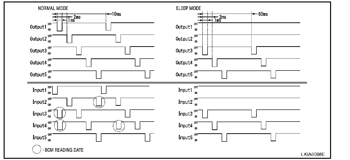 When BCM is in sleep status, output from OUTPUT 1 and 2 transistors stops, with BCM entering a power-saving mode. OUTPUT (3 - 5) turn ON-OFF every 60 ms, and only input from light switch system is accepted.