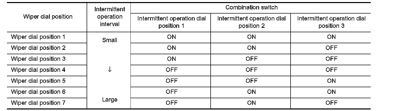 Wiper intermittent operation delay interval is determined from a combination of 3 switches (intermittent operation dial position 1 intermittent operation dial position 2, and intermittent operation dial position 3) and vehicle speed signal.
