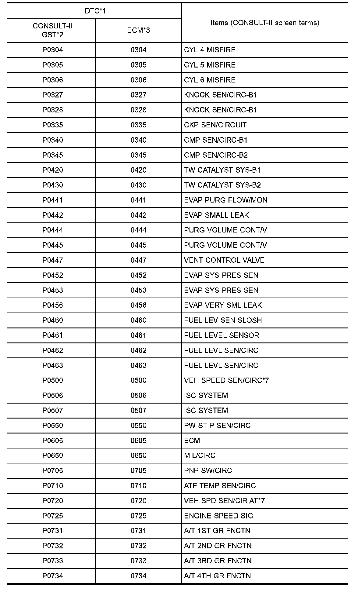 DTC No. Index (P0304 - P0734):
