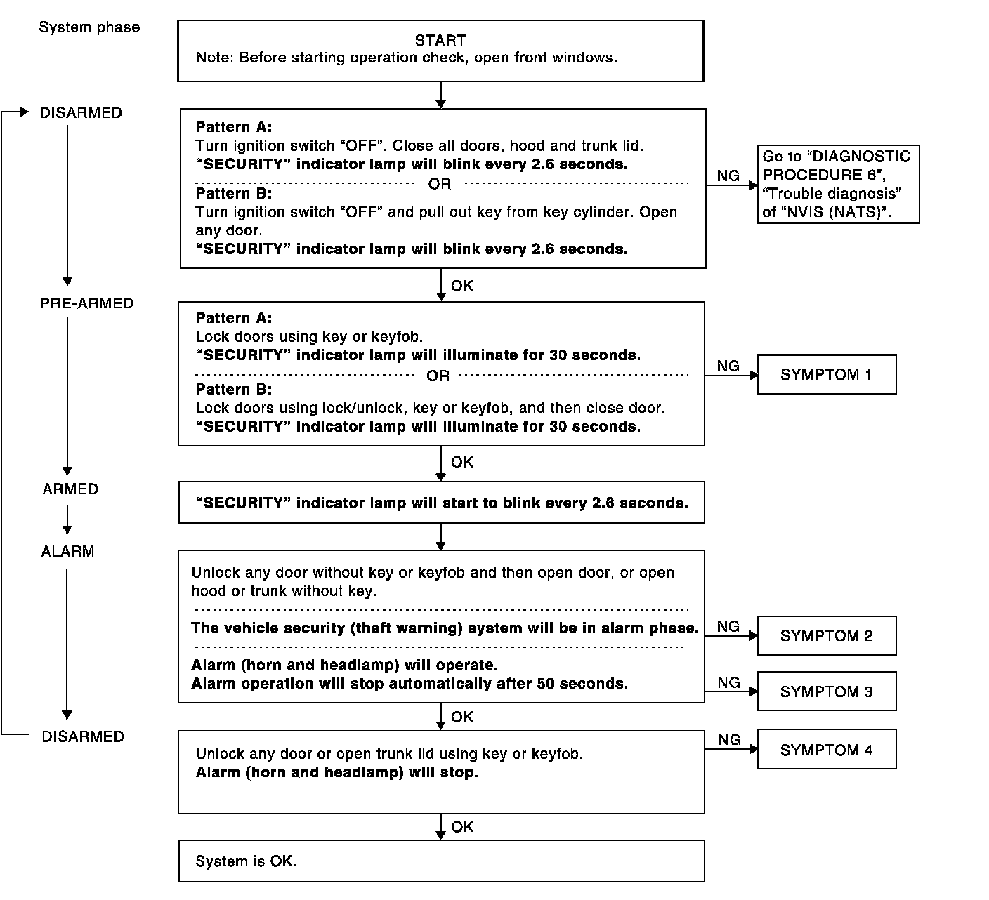 The system operation is canceled by turning ignition switch to "ACC" at any step between START and ARMED in the following flow chart.