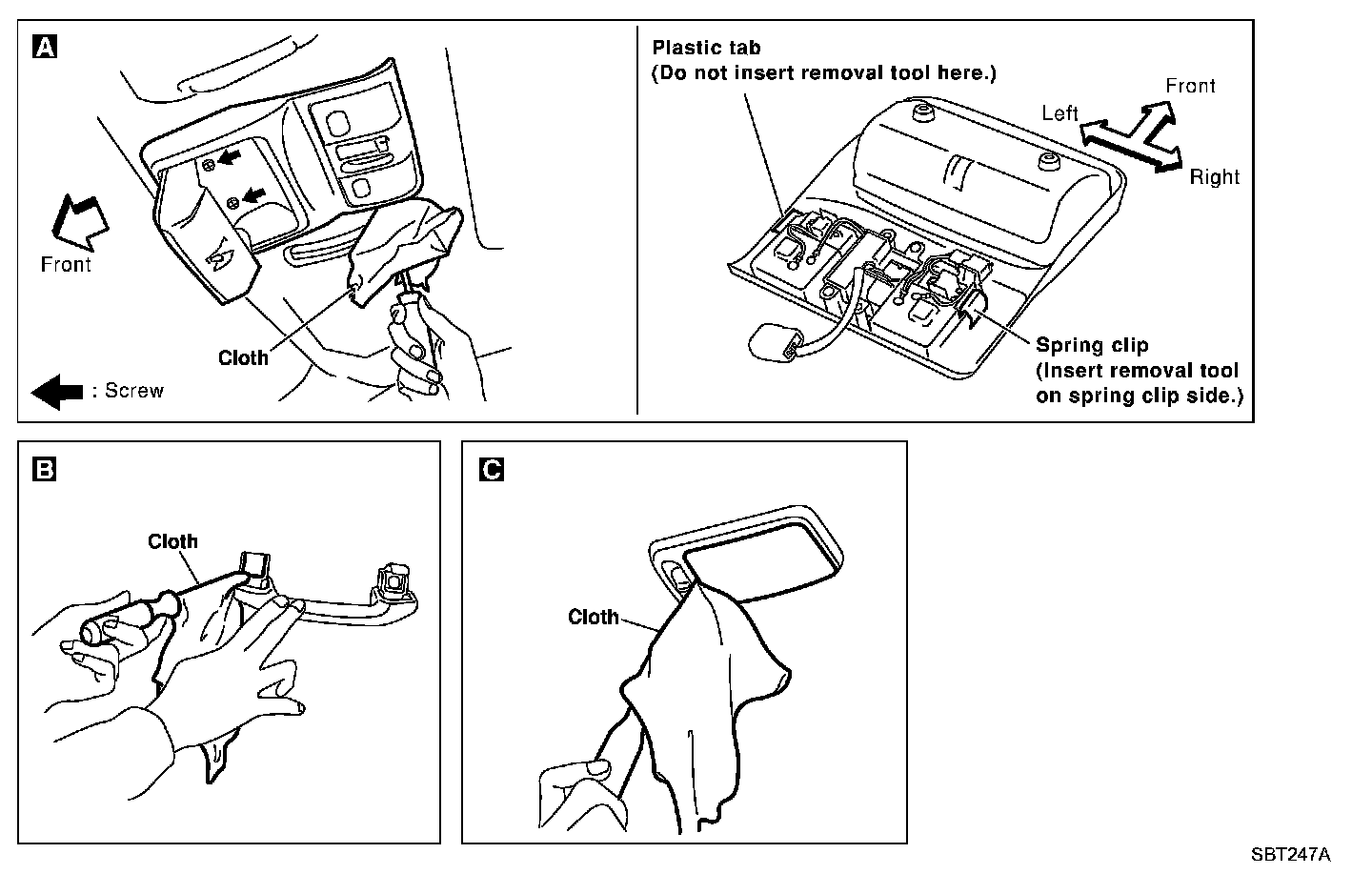 6. Remove two screws from the roof console of map lamp, and insert a removal tool wrapped in clean cloth between the right-hand side of the map lamp and headlining, then remove the roof console and disconnect connectors.[A]