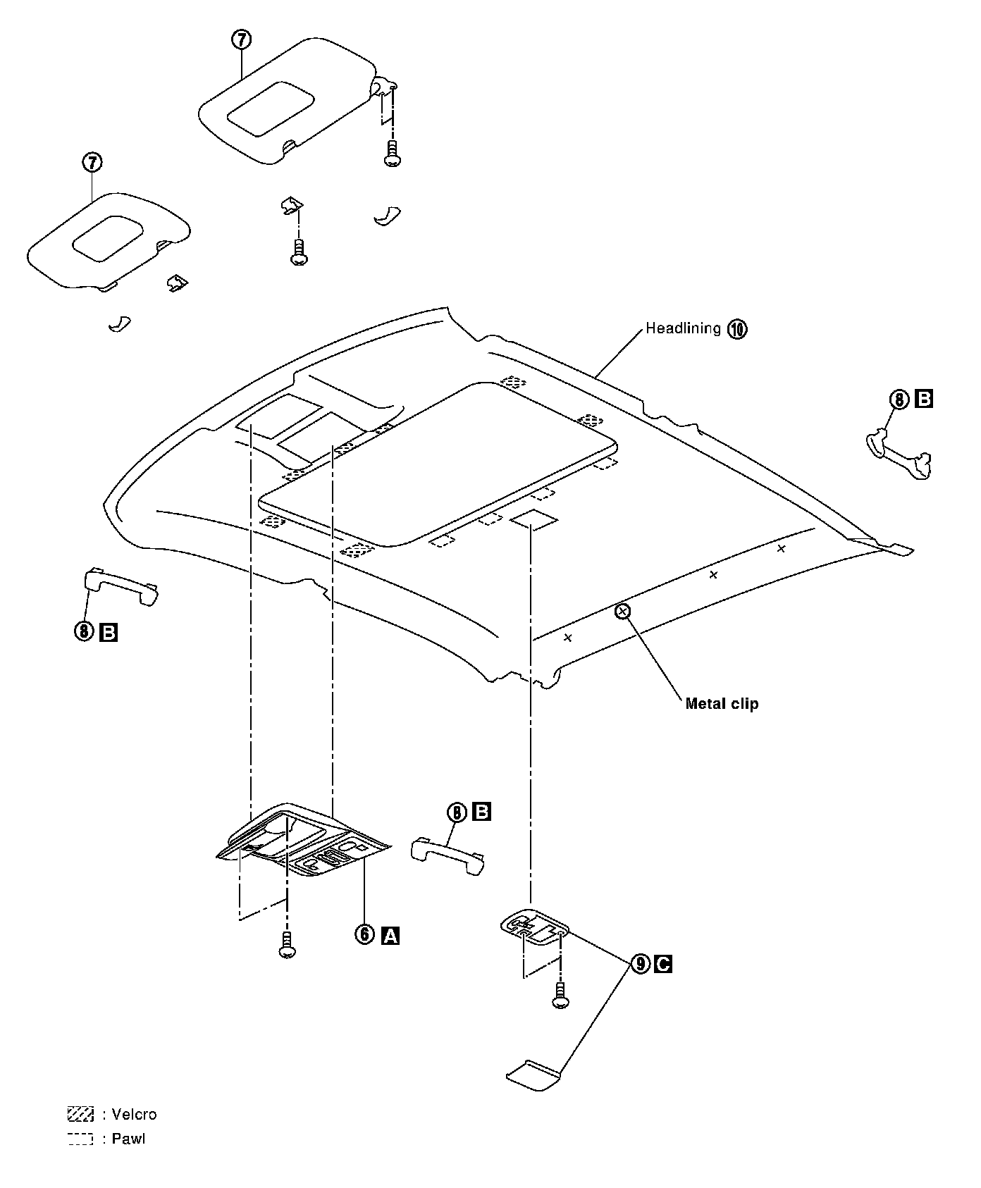 10. Remove metal clip securing headlining, then remove headlining from vehicle through front passenger side.