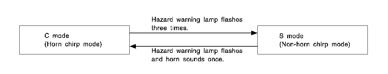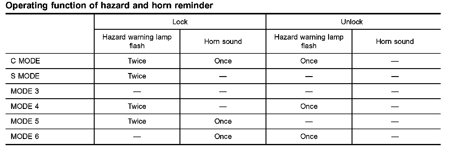 When LOCK and UNLOCK signals are sent from the keyfob for more than 2 seconds at the same time the hazard and horn reminder mode is changed and hazard warning lamp flashes and horn sounds as follows: