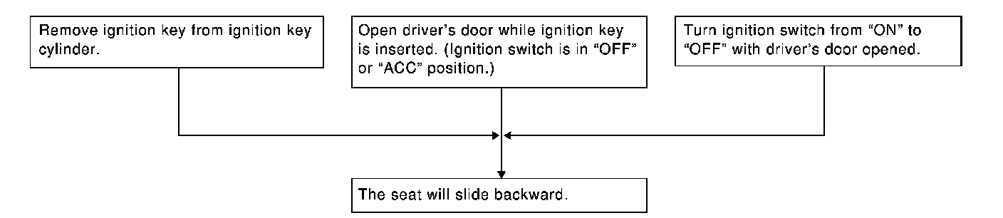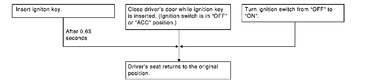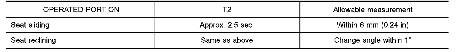 When the ignition switch is in the ON position, if any of the parts (indicated in the following chart) move more than the specified amount within a period T2" when no ON" input is sent from any of the switches (indicated in the following chart), or an output from the automatic drive positioner is not produced, an output failure is sensed. Motor operation will be suspended automatically, and all automatic operations will be ineffective. (In this case, the motor will not operate manually.)