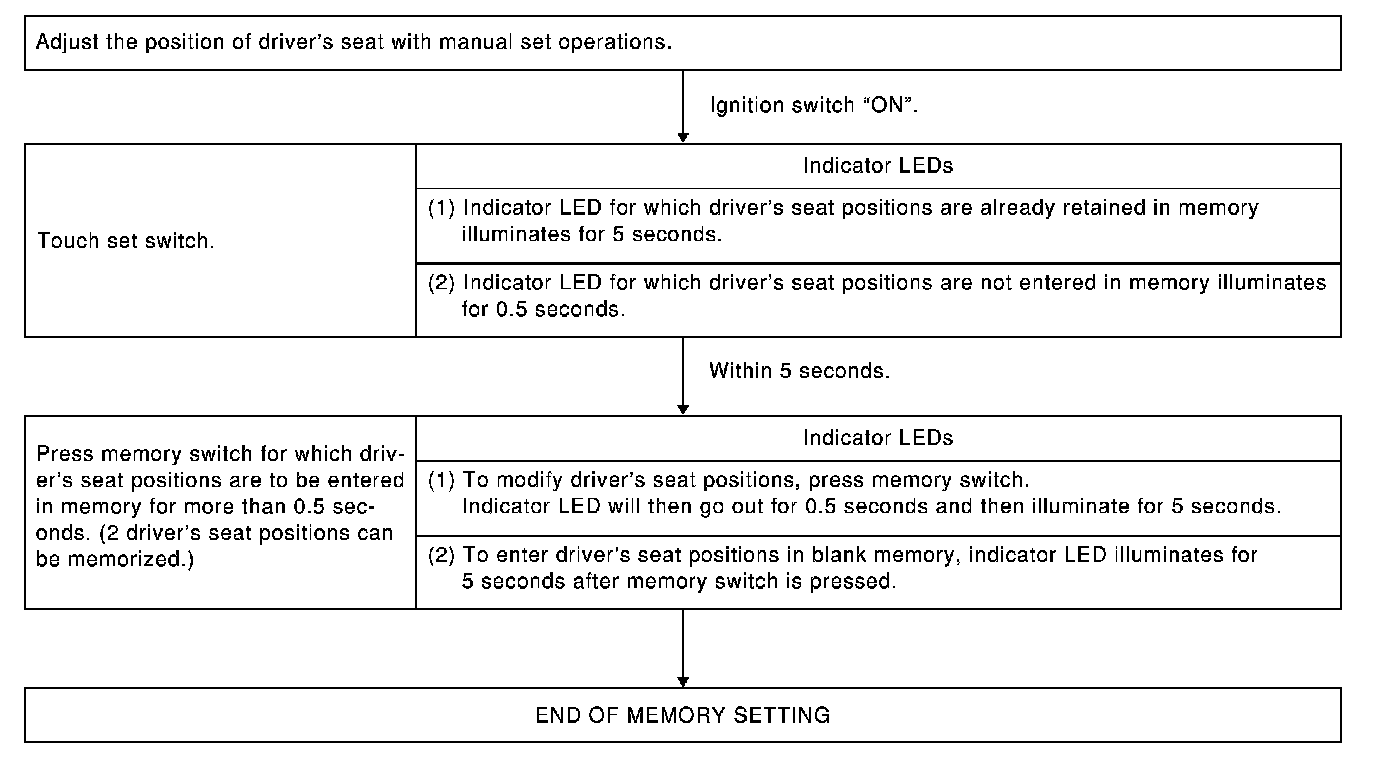 - When memory switch for which driver's seat positions are already retained in memory is pressed new seat positions will be retained in memory in place of the previously set positions.