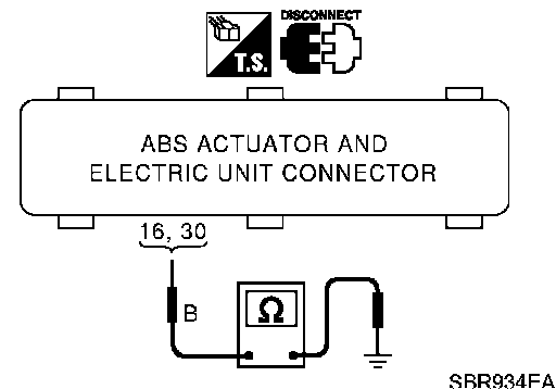 - Check continuity between ABS actuator and electric unit harness connector E9 (M/T models), E169 (A/T models) terminals 16 (B), 30 (B) and ground.