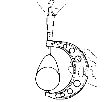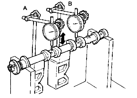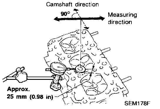 1. Measure valve deflection as shown in the figure. (Valve and valve guide mostly wear in this direction.)