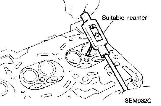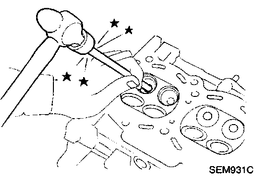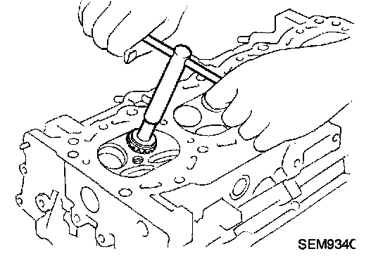 2. Drive out valve guide with a press [under a 20 kN (2 ton, 2.2 US ton, 2.0 Imp ton) pressure] or hammer and suitable tool.