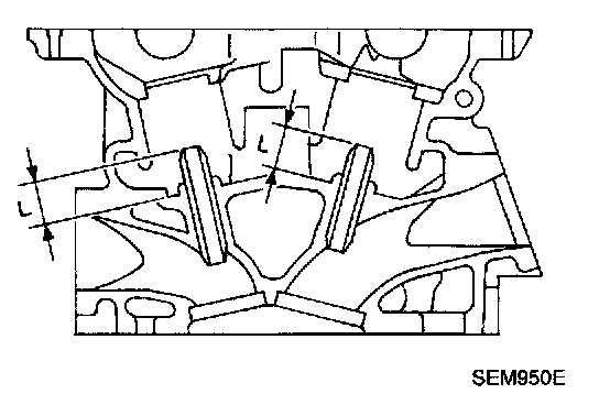 ^ Check valve seats for any evidence of pitting at valve contact surface, and reseat or replace if it has worn out excessively. Before repairing valve seats, check valve and valve guide for wear. If they have worn, replace them. Then correct valve seat.