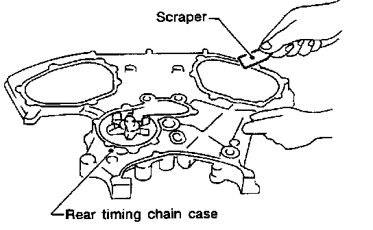 INSTALLATION1. Before installing rear timing chain case, remove old liquid gasket from mating surface using a scraper. Also remove old liquid gasket from mating surface of cylinder block.