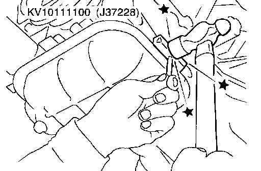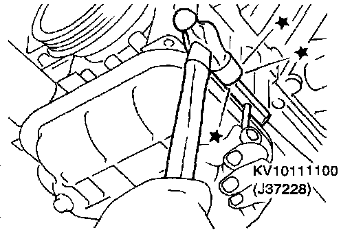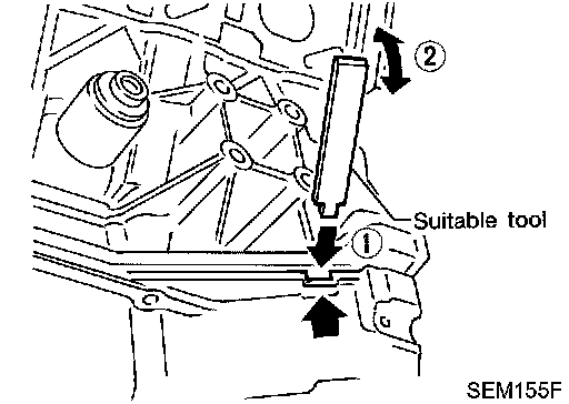 a. Insert an appropriate size tool into the notch of aluminum oil pan as shown in the figure. Be careful not to damage aluminum mating surface. Do not insert screwdriver, or oil pan flange will be deformed.