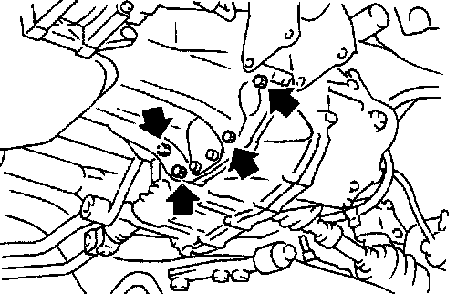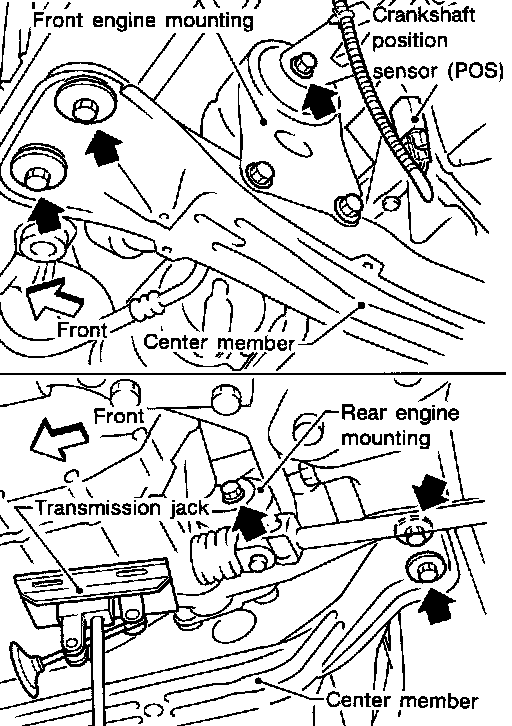 7. Install front and rear engine mounting insulator nuts and bolts.