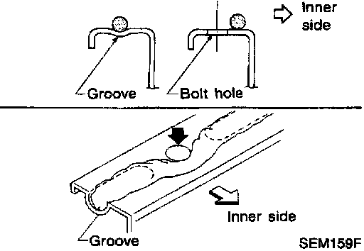 d. Apply liquid gasket to inner sealing surface as shown in figure. Be sure liquid gasket is 4.0 to 5.0 mm (0.157 to 0.197 inch) or 4.5 to 5.5 mm (0.177 to 0.217 inch) wide as shown in the figure.