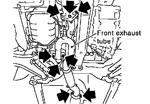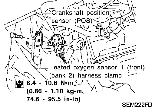 ^ Make sure that crankshaft position sensor (POS) and heated oxygen sensor 1 (front) (bank 2) harness clamp are installed correctly as shown in figure.