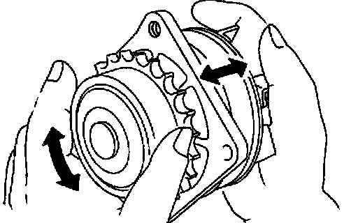 ^ When removing water pump assembly, be careful not to get coolant on drive belt.