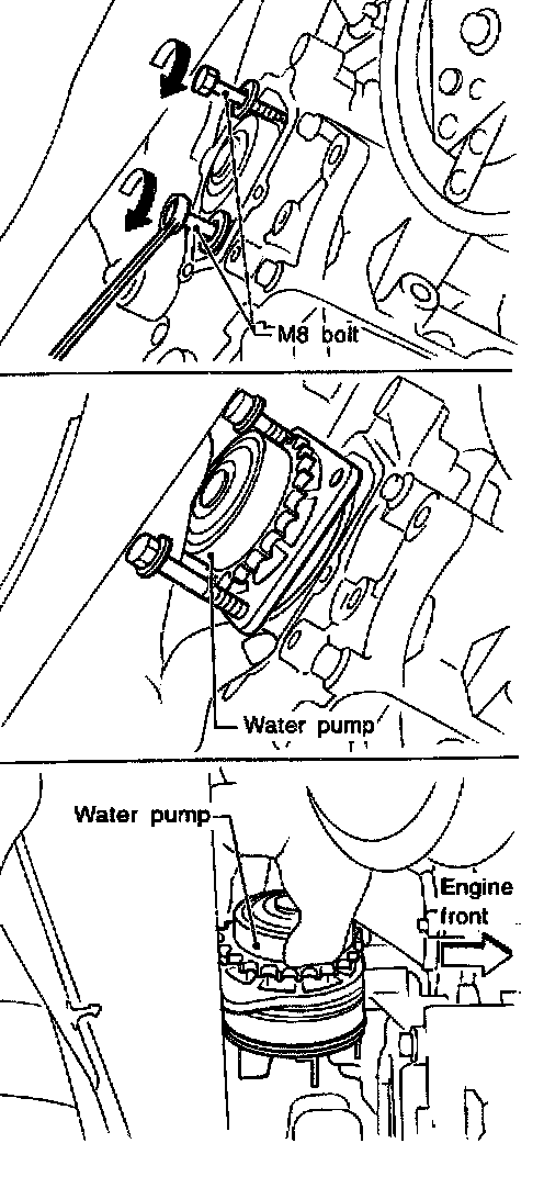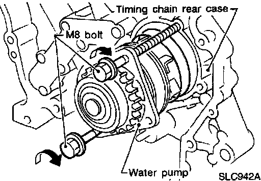 14. Tighten M8 bolts by turning half turn alternately until they reach timing chain rear case. In order to prevent damage to water pump or timing chain rear case, do not tighten one bolt continuously. Always turn each bolt half turn each time.