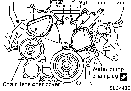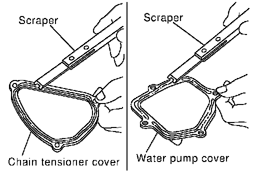 3. Before installing, remove all traces of liquid gasket from mating surface of water pump cover and chain tensioner cover using a scraper. Also remove traces of liquid gasket from mating surface of front cover.