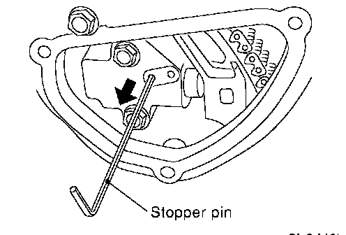 7. Insert stopper pin into tensioner body hole to fix lever, and keep the tab released.