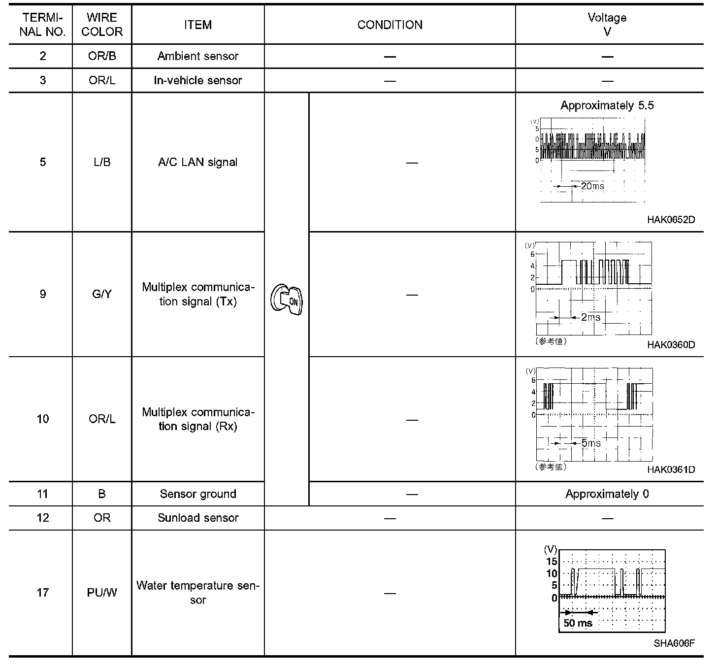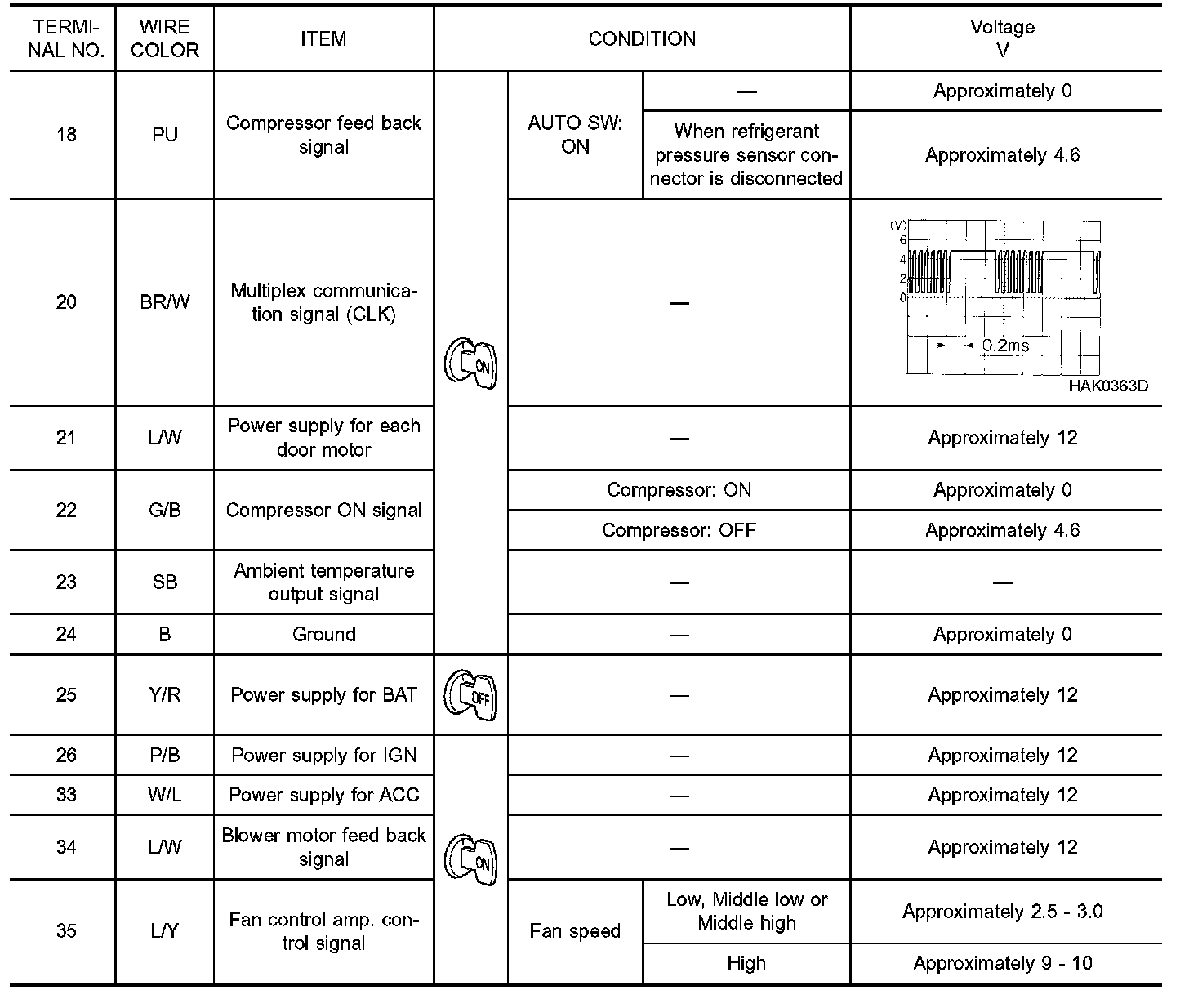 - Measure voltage between each terminal and body ground by following "AUTO AMP. INSPECTION TABLE".