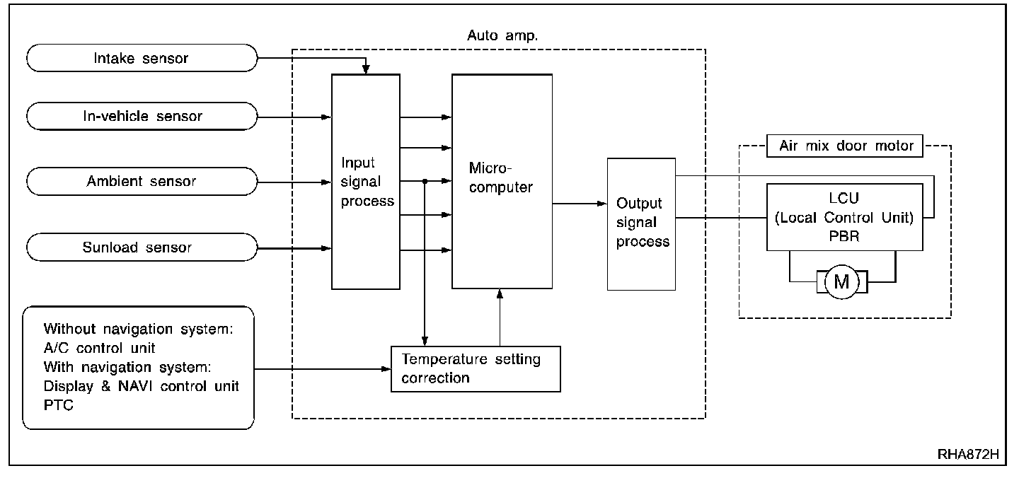 The auto amplifier receives data from each of the sensors. The amplifier sends air mix door, mode door, intake door opening angle data to the air mix door motor LCU, mode door motor LCU and intake door motor LCU. The air mix door motor, mode door motor and intake door motor read their respective signals according to the address signal. Opening angle indication signals received from the auto amplifier and each of the motor position sensors are compared by the LCUs in each motor with the existing decision and opening angles. Subsequently, HOT/COLD or DEFROST/VENT operation is selected. The new selection data is returned to the auto amplifier.