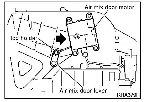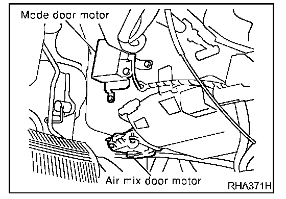 The air mix door motor is attached to the heater unit. It rotates so that the air mix door is opened or closed to a position set by the auto amplifier. Motor rotation is then conveyed through a shaft and the air mix door position is then fed back to the auto amplifier by PBR built-in air mix door motor.