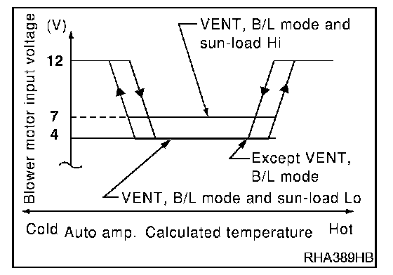 In the automatic mode, the blower motor speed is calculated by the automatic amplifier based on inputs from the PBR, in-vehicle sensor, sunload sensor, intake sensor and ambient sensor. The blower motor applied voltage ranges from approximately 5 volts (lowest speed) to 12 volts (highest speed).