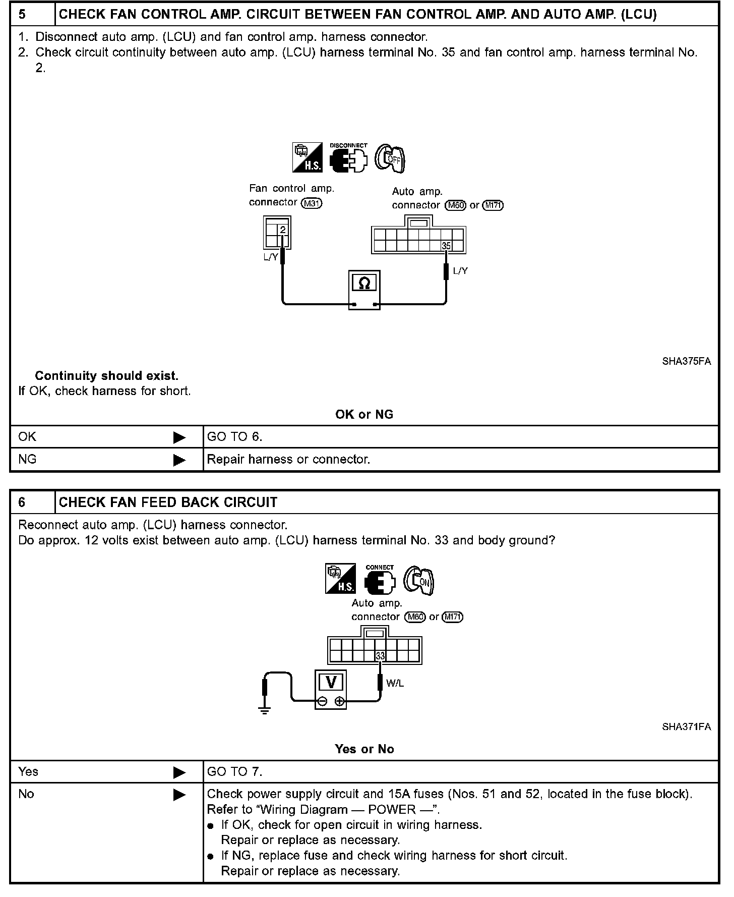 The fan control amplifier is located on the cooling unit. The fan control amp. receives a gate voltage from the auto amp. to steplessly maintain the blower fan motor voltage in the 5 to 12 volt range (approx.).