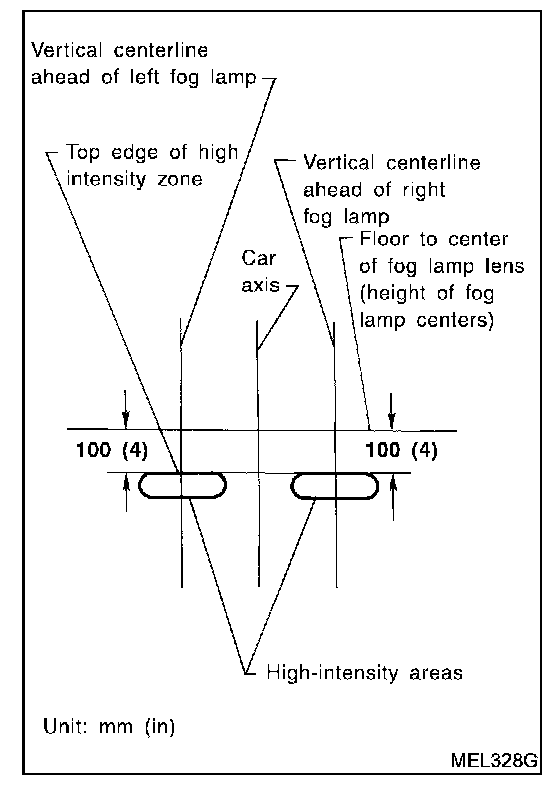 4. Adjust front fog lamps so that the top edge of the high intensity zone is 100 mm (4 in) below the height of the fog lamp centers as shown.