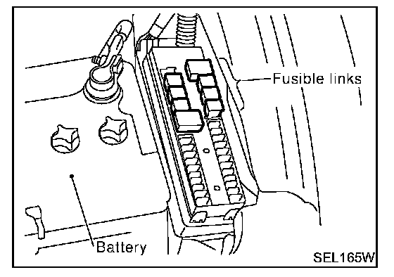 - If fusible link should melt, it is possible that critical circuit (power supply or large current carrying circuit) is shorted. In such a case, carefully check and eliminate cause of problem.