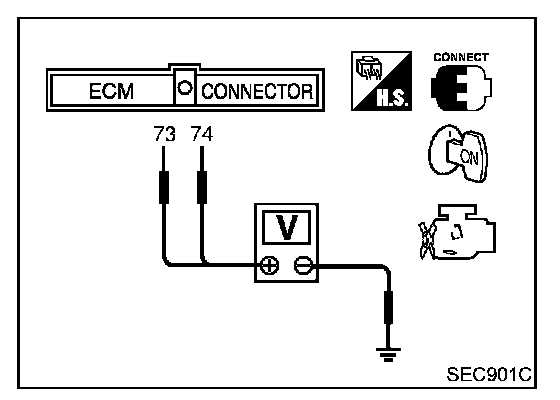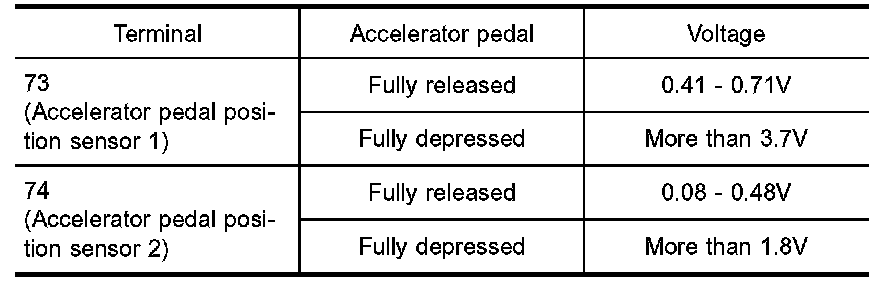 3. Check voltage between ECM terminals 73 (APP sensor 1 signal), 74 (APP sensor 2 signal) and engine ground under the given conditions.