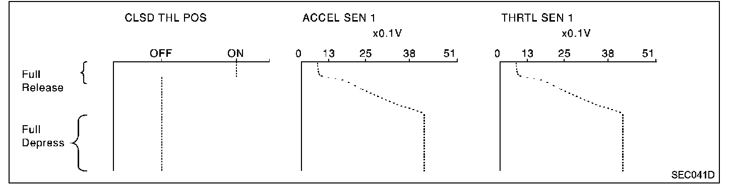 Above is the data for "CLSD THL POS", "ACCEL SEN1" and "THRTL SEN1" when depressing the accelerator pedal with the ignition switch "ON" and with selector lever in "D" position (AT models) or with shift lever in "1st" position (MT models).