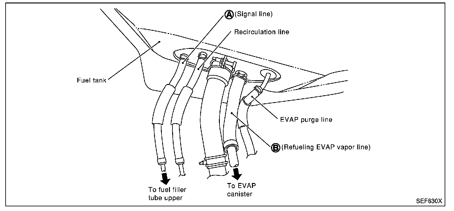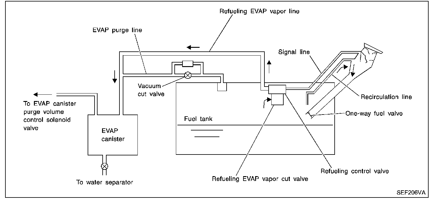 When the refueling has reached the full level of the fuel tank, the refueling EVAP vapor cut valve is closed and refueling is stopped because of auto shut-off. The vapor which was absorbed by the EVAP canister is purged during driving.