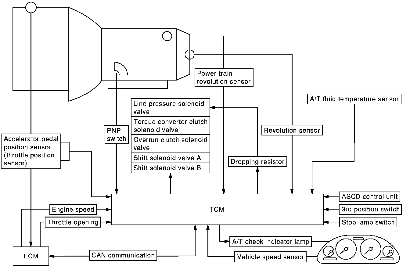 The automatic transaxle senses vehicle operating conditions through various sensors. It always controls the optimum shift position and reduces shifting and lock-up shocks.