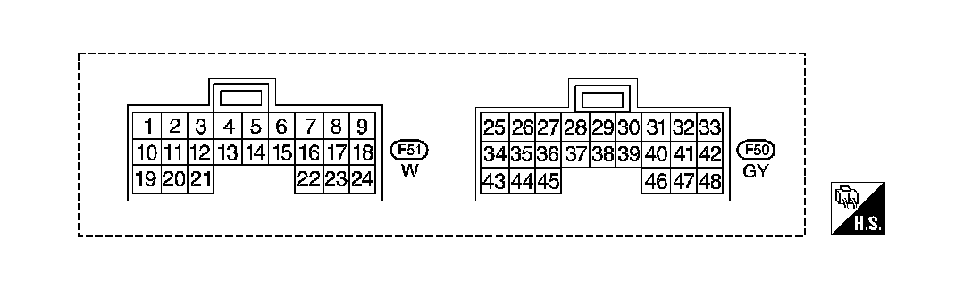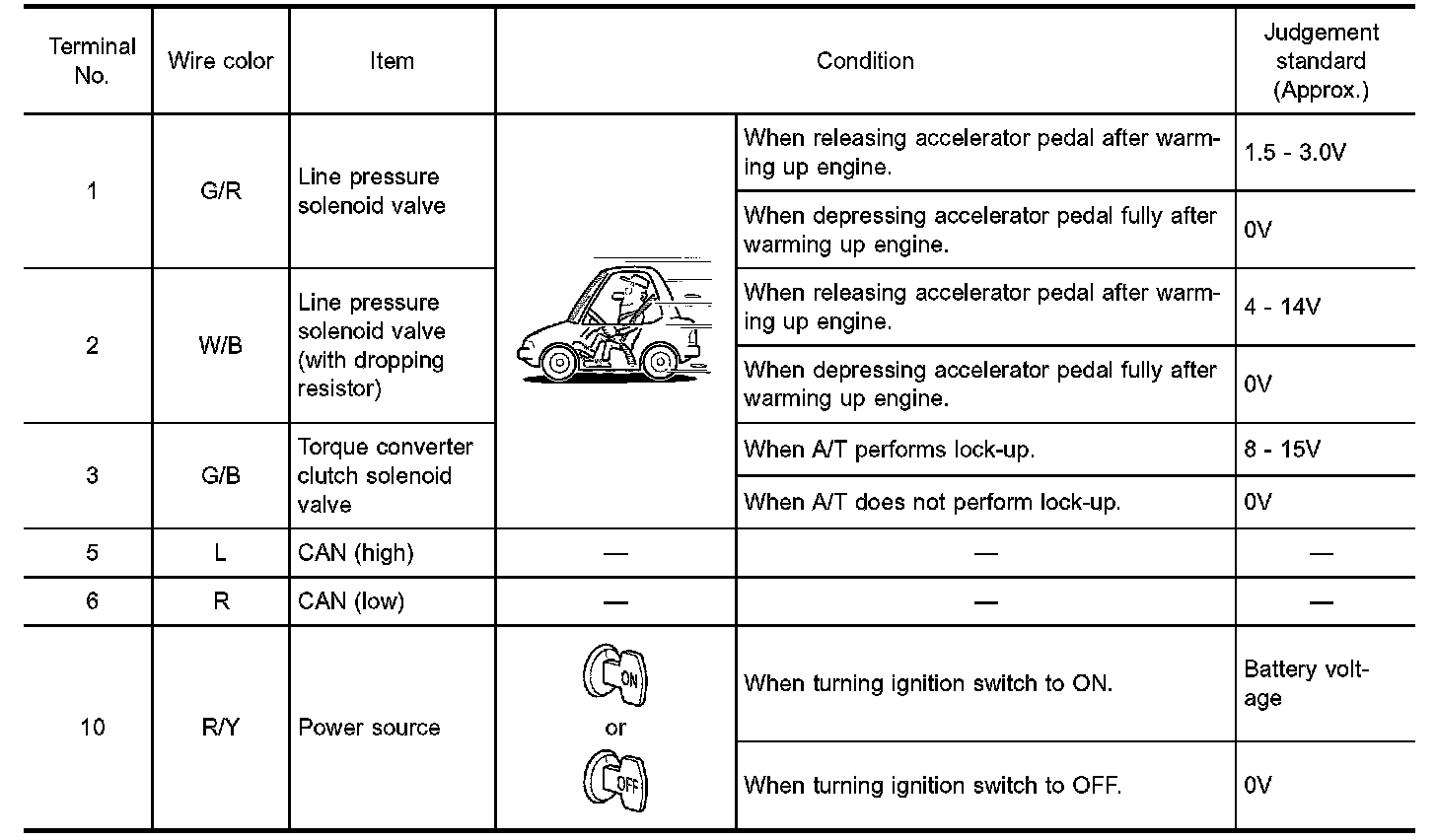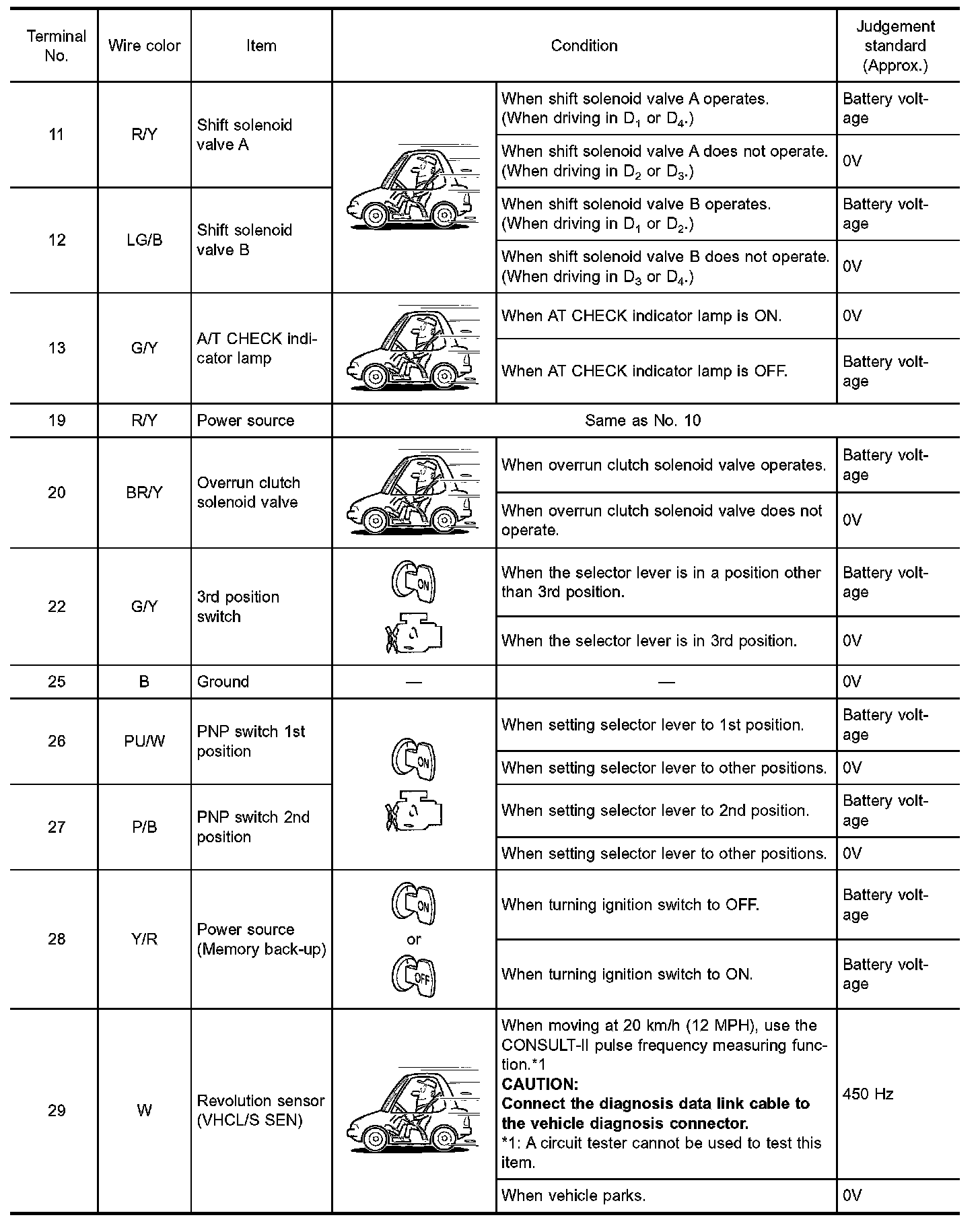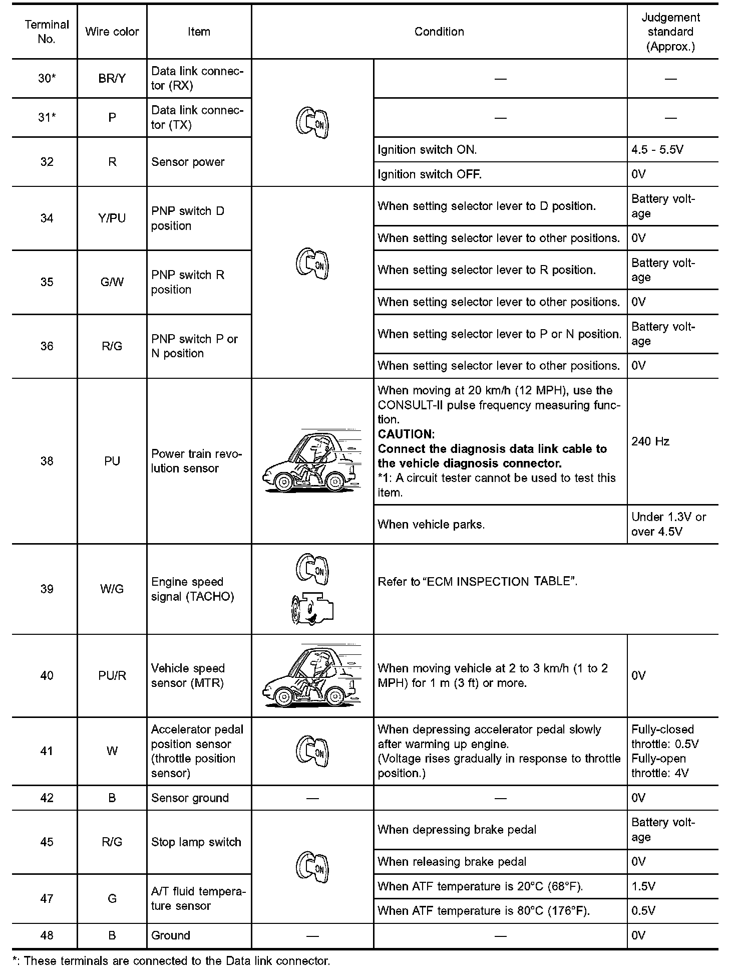 - Measure voltage between each terminal and terminal 25 or 48 by following "TCM INSPECTION TABLE".